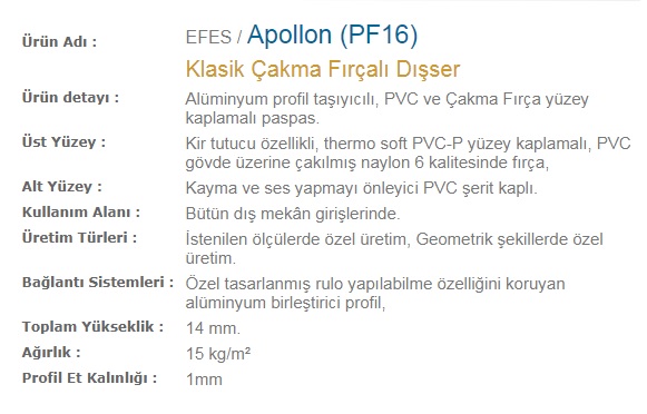 Apollon (PF16) Ürün Özellikleri