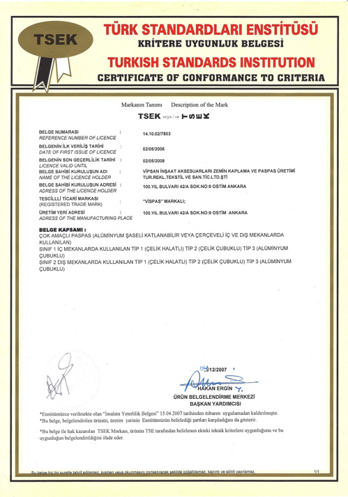 vispas TSEK CRITERION CERTIFICATE We have obtained TSE (Turkish Standart Instute) and ISO certifications with VISPAS brand.