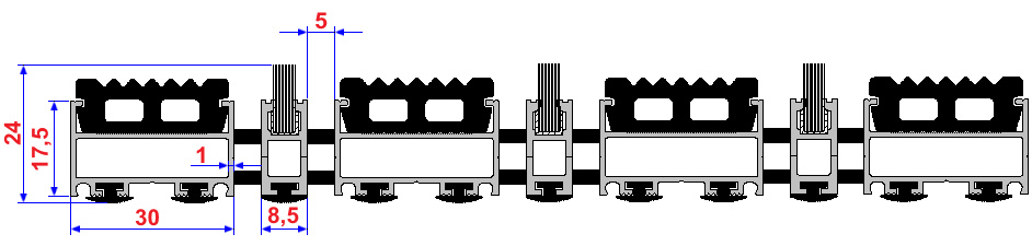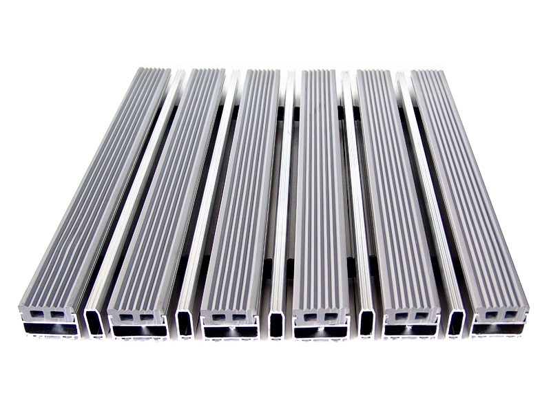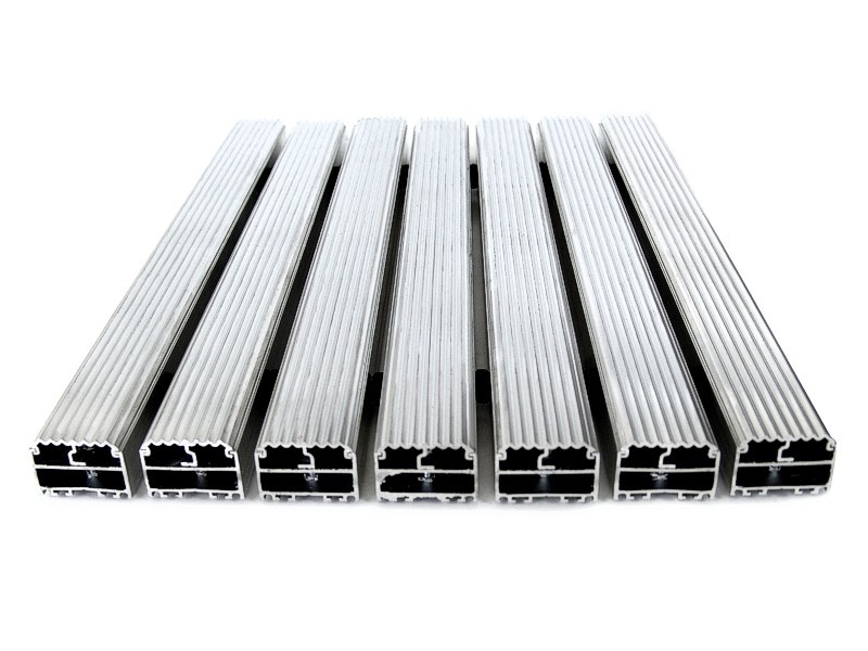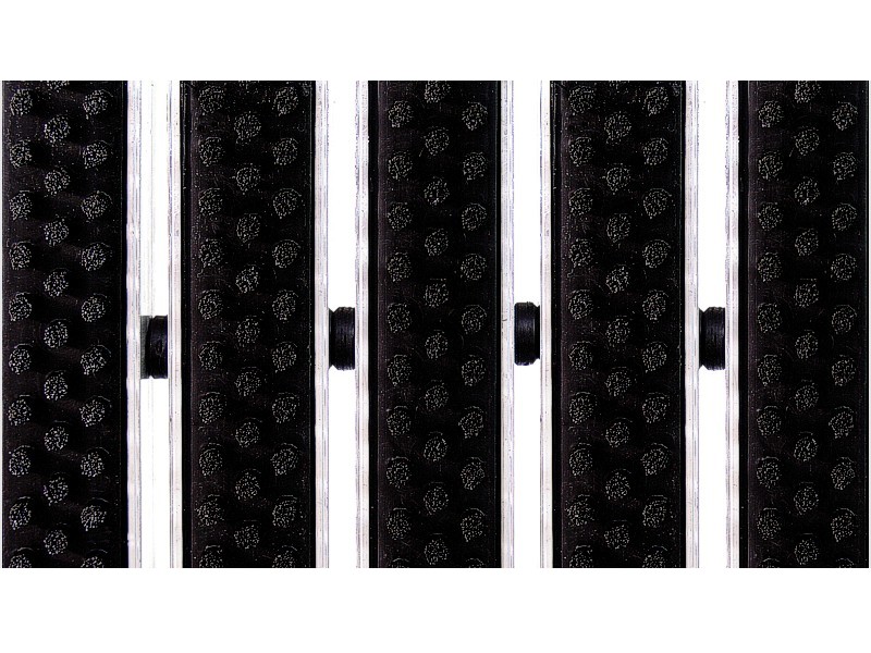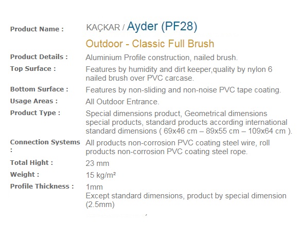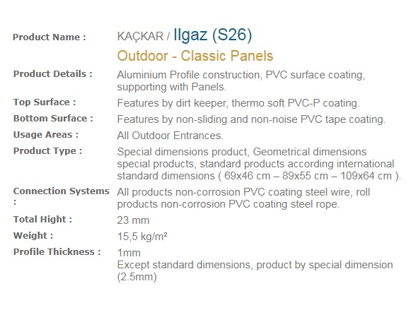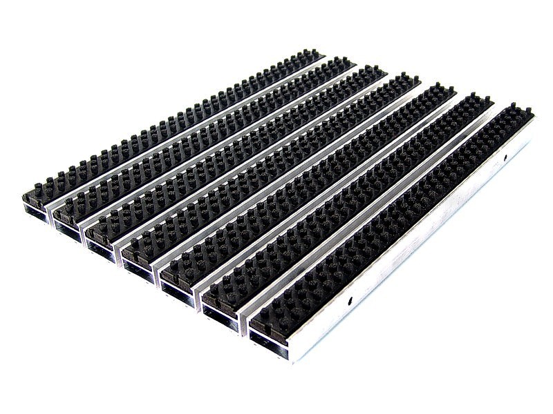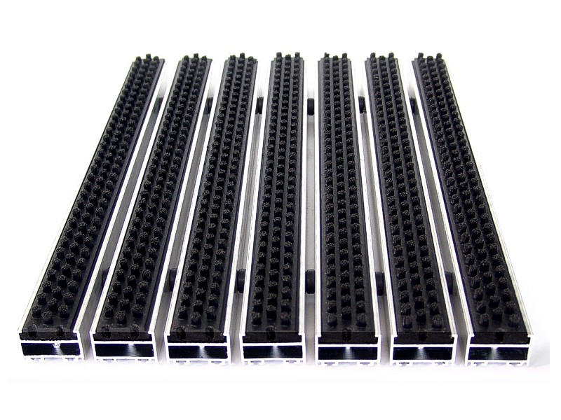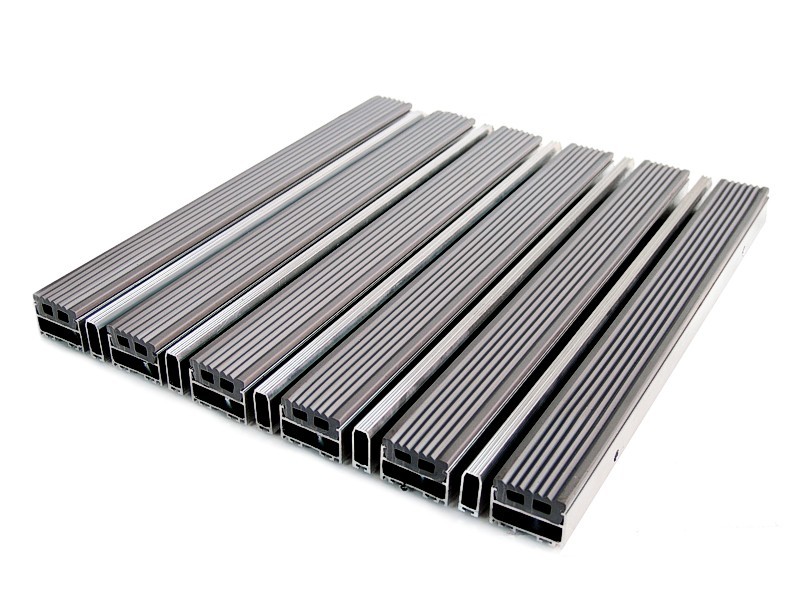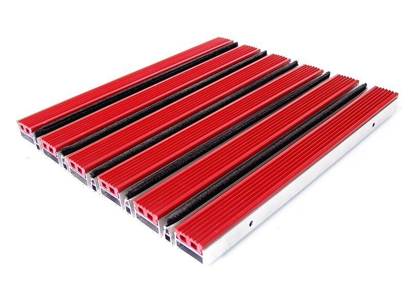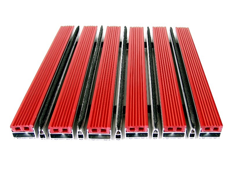 Aluminium Profile construction, PVC surface coating. Features by dirt keeper, thermo soft PVC-P coating. Features by non-sliding and non-noise PVC tape coating. All Outdoor Entrances.