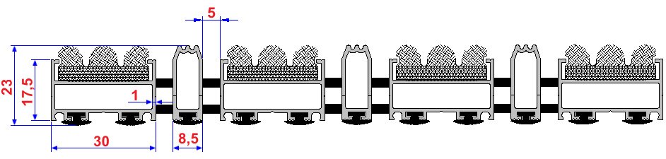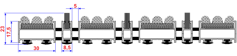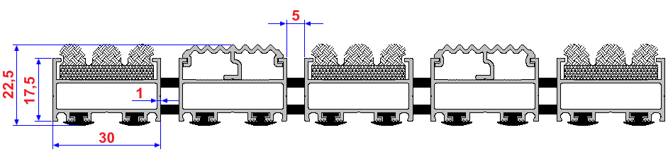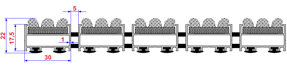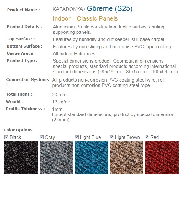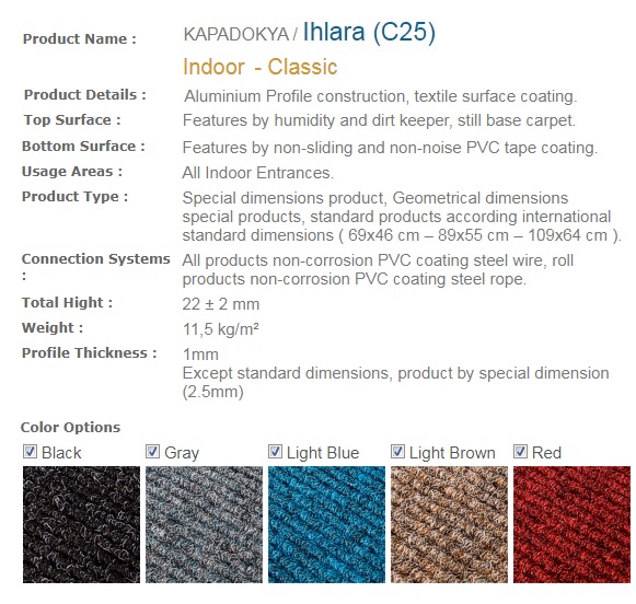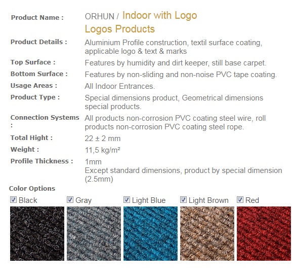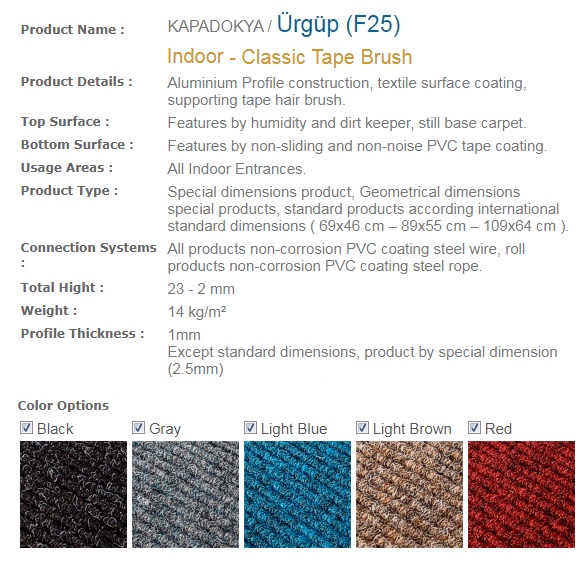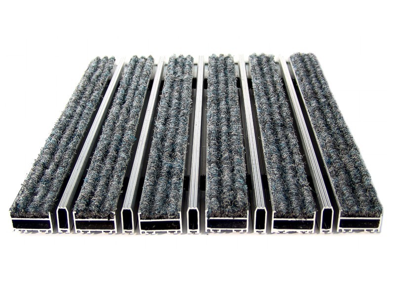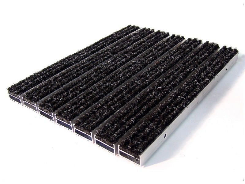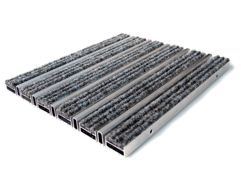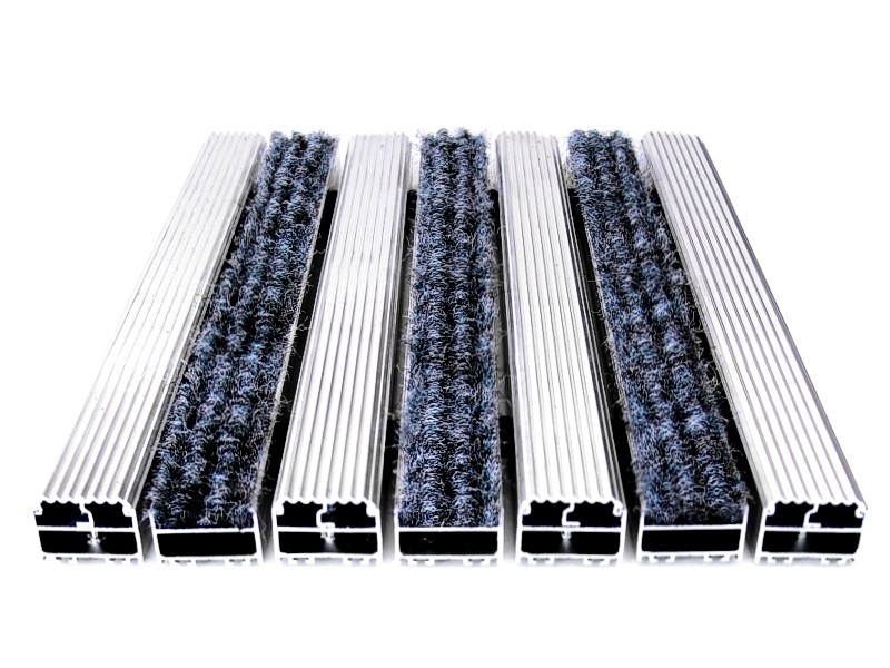 Aluminium Profile construction, textile surface coating. Features by humidity and dirt keeper, still base carpet. Features by non-sliding and non-noise PVC tape coating. All Indoor Entrances.