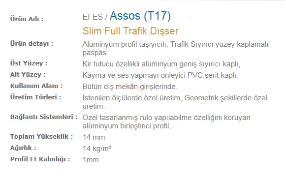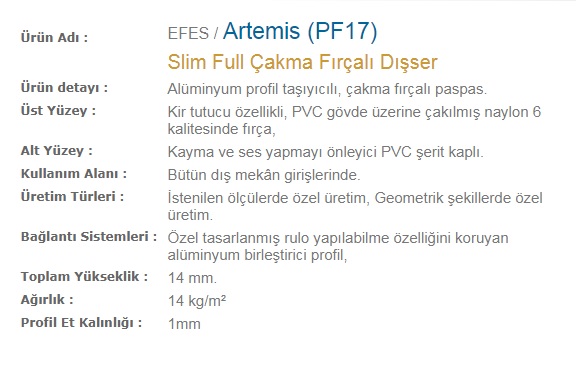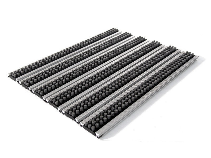 Alüminyum profil taşıyıcılı, PVC yüzey kaplamalı paspas. Kir tutucu özellikli thermo soft PVC-P kaplı. Kayma ve ses yapmayı önleyici PVC şerit kaplı. Bütün dış mekân girişlerinde.
