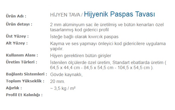 VİSPAS Hijyenik Paspas Tavası Ürün Özellikleri